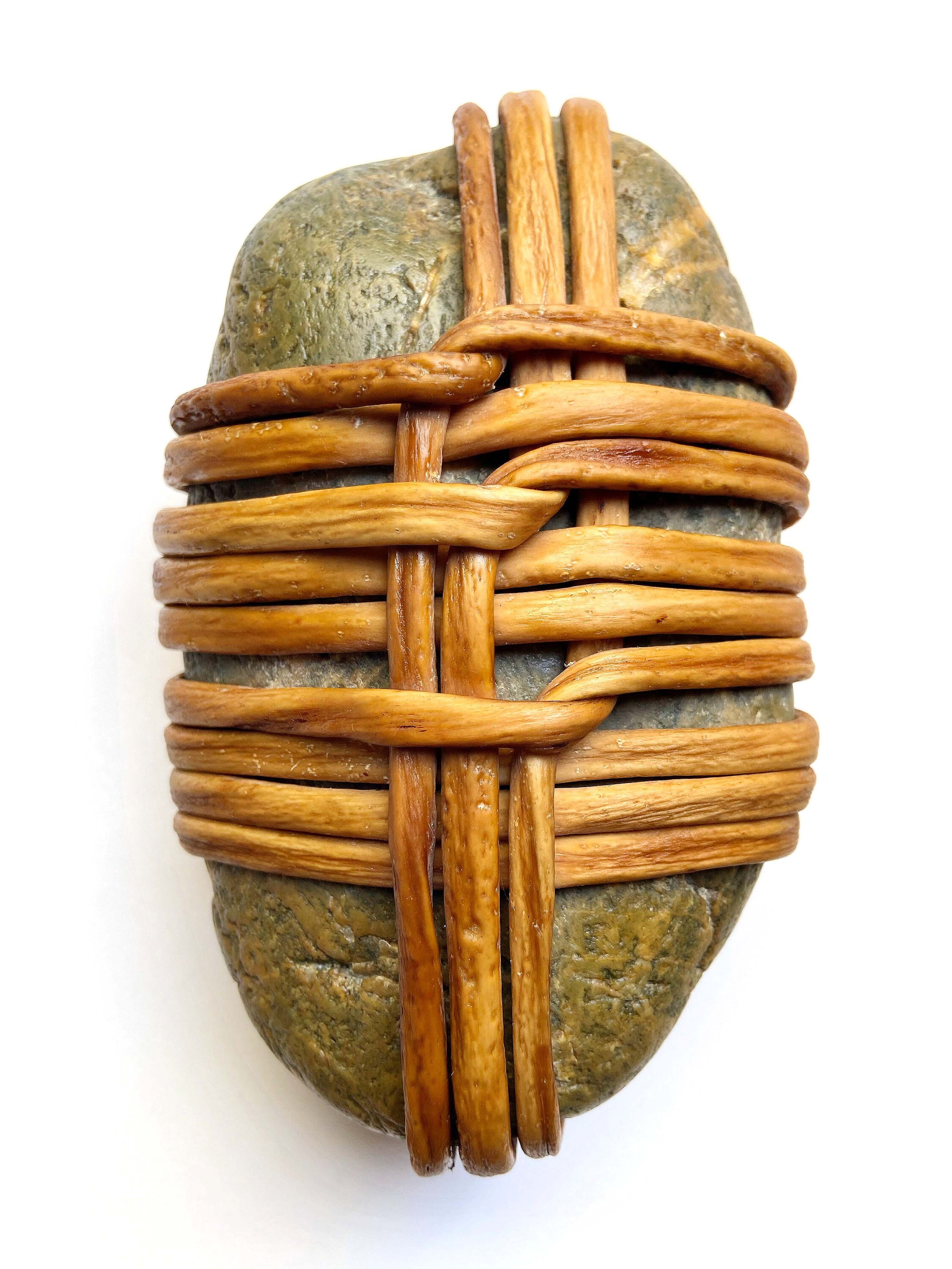 A kelp fiber rock wrap designed and created by J.D. Lenzen. Both kelp fibers and stone collected along the Northern California Coast. The kelp utilized for the piece was prepared over the course of weeks, through a process of wetting, stretching, and drying, until the associated fibers achieved the thickness, pliability, and color desired. Following completion of the rock wrap, the piece was tightened as it dried. The fibers associated with the final piece are locked tight around the stone and have the appearance consistency of light and medium aged wood.